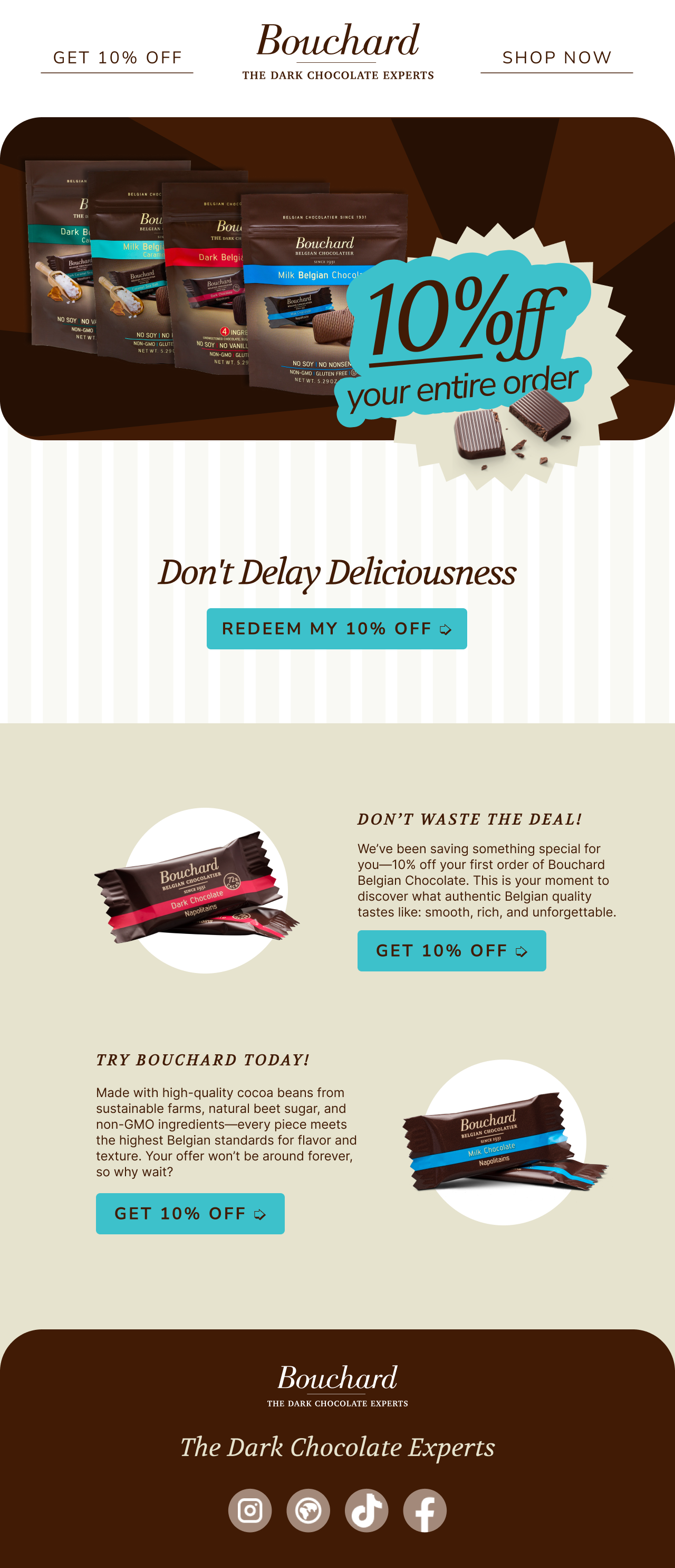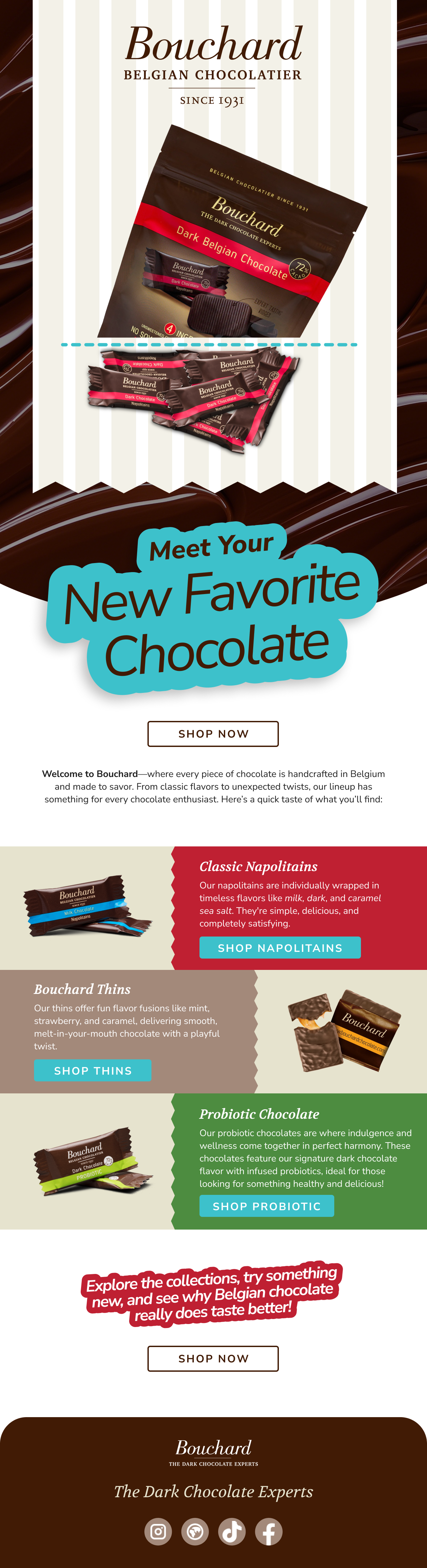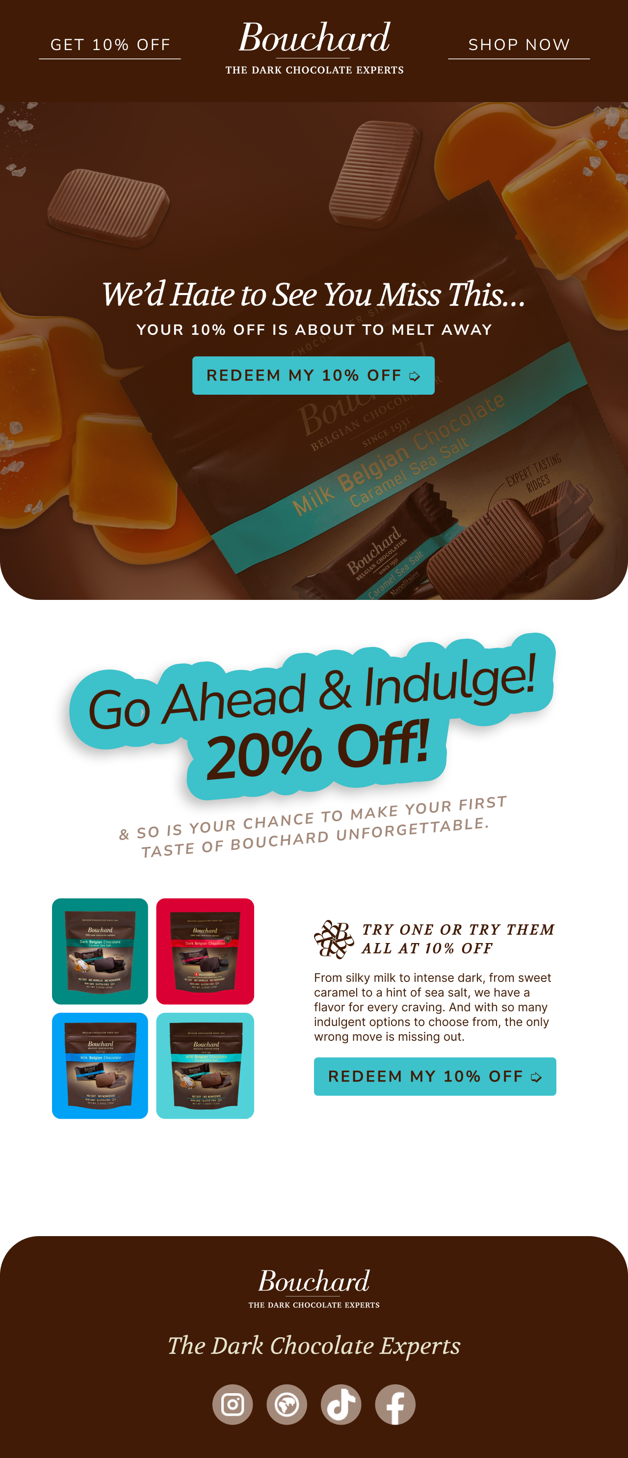 The Bouchard Welcome Series Email Automations set the tone for our new email subscribers. Their purpose is to familiarize the consumer with the brand, entice them to place an order, and make their mouth water. Bouchard is one of my favorite clients to work with. While particular at times, something about working with a product like chocolate gives you a lot of opportunity for play and texture.