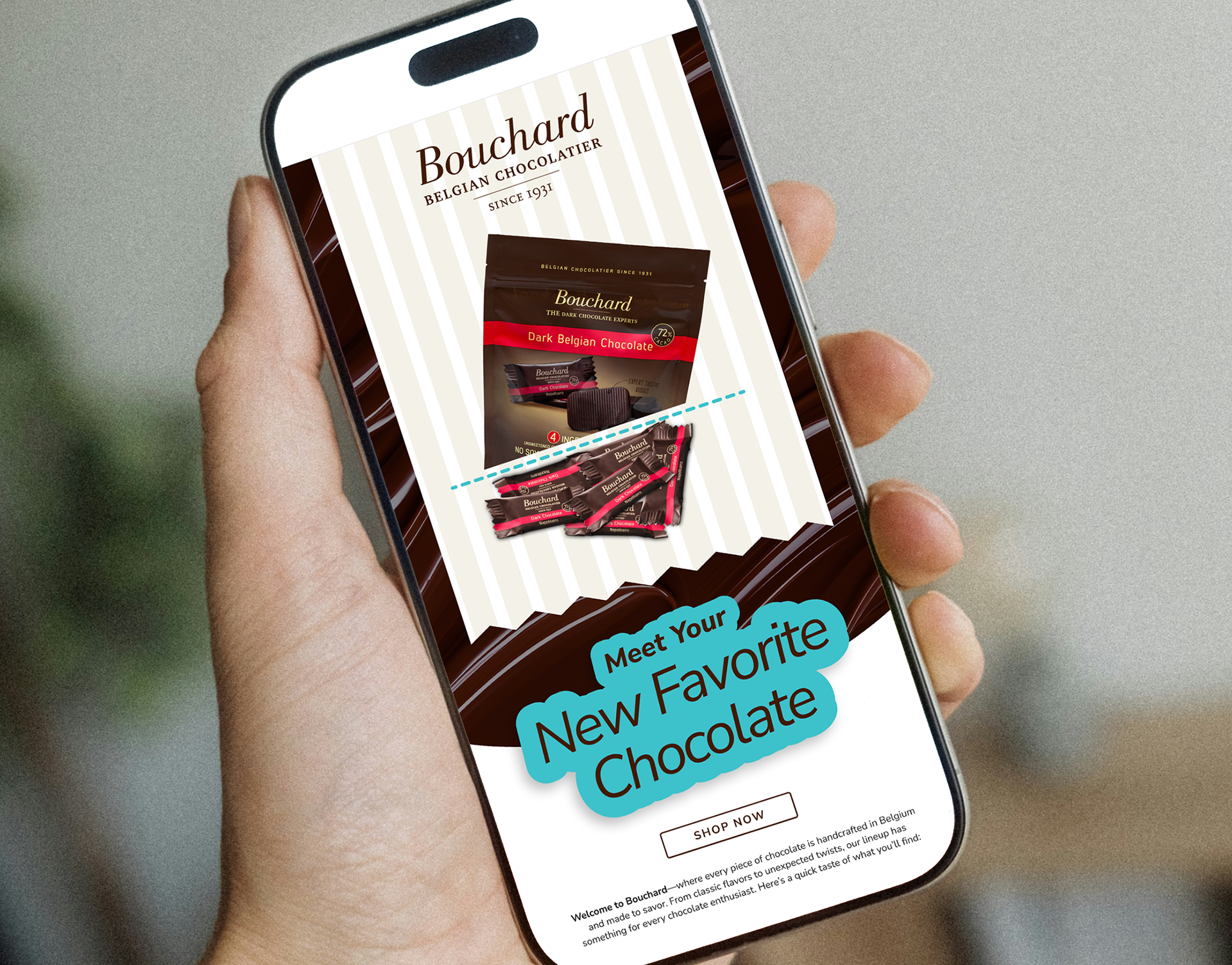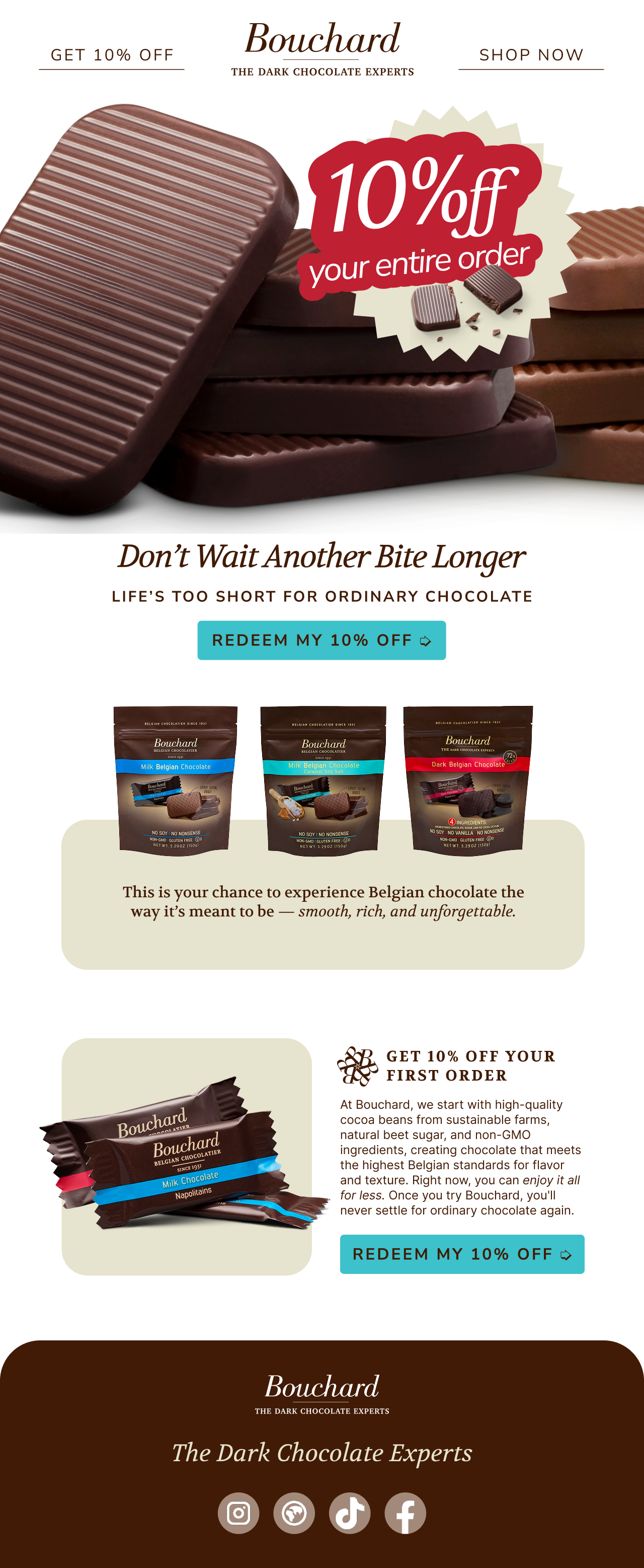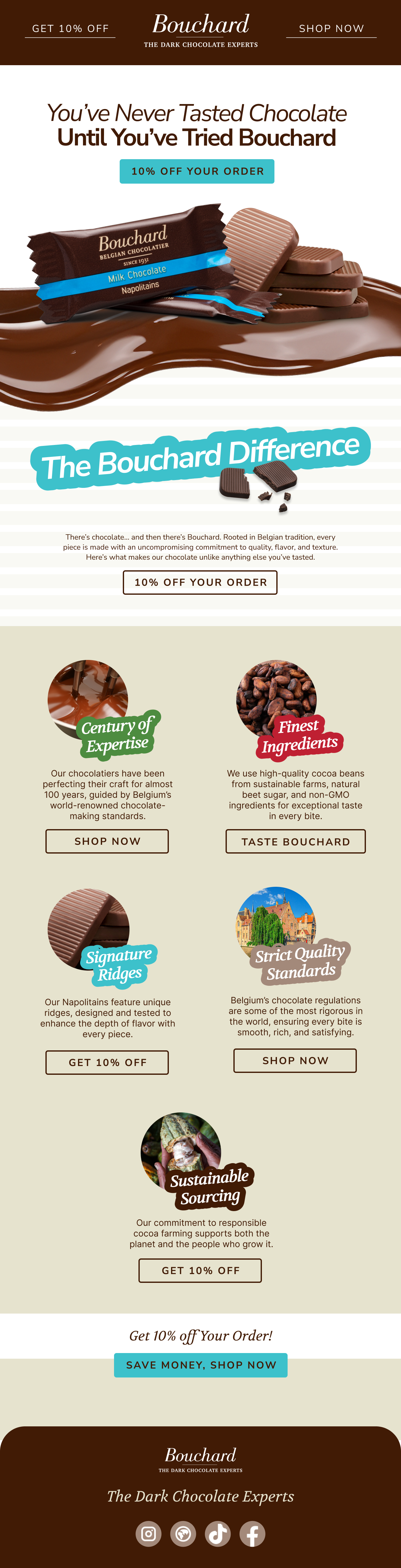 The Bouchard Welcome Series Email Automations set the tone for our new email subscribers. Their purpose is to familiarize the consumer with the brand, entice them to place an order, and make their mouth water. Bouchard is one of my favorite clients to work with. While particular at times, something about working with a product like chocolate gives you a lot of opportunity for play and texture.